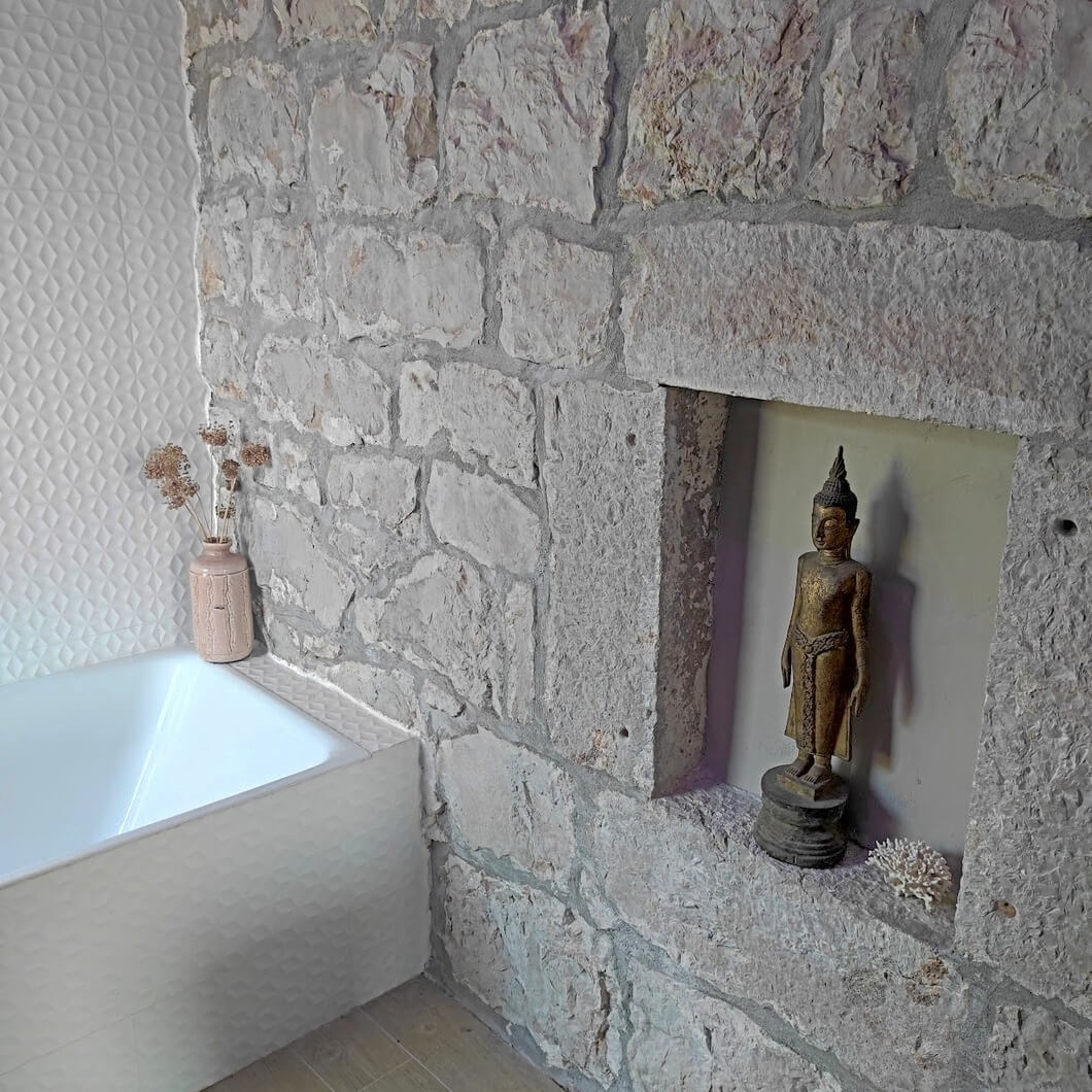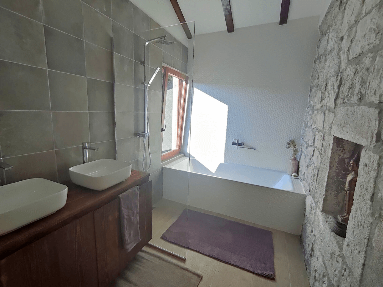 The modern bathroom boasts a high ceiling and a striking stone wall, adding a touch of elegance to the space. It includes a large 2 persons bathtub, a shower and 2 washing bassins.