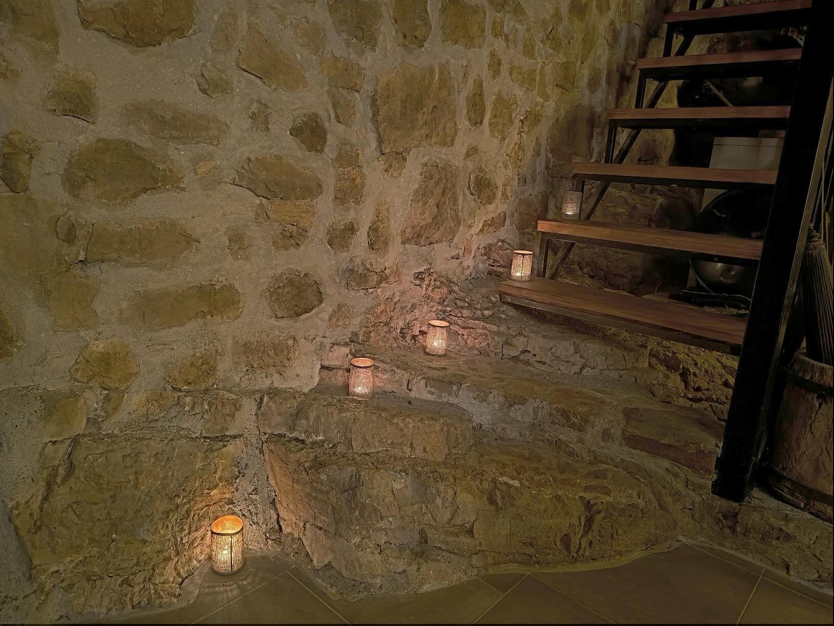 The main stone house (+/- 120 m2) features a spacious living space (+/- 60 m2) with high ceiling and exposed beams. An open fire and an ancient stone sitting area with original stone flooring integrates seamlessly with an open kitchen.